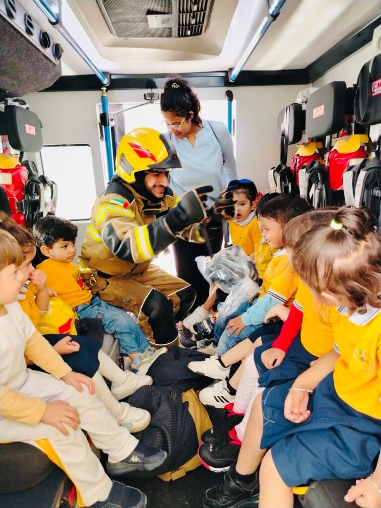 At our Preschool in Sharjah , We aim to offer learning experiences that nurture all areas of development academically, socially, emotionally and physically. Community outings like visiting the fire station play an integral part of this approach.